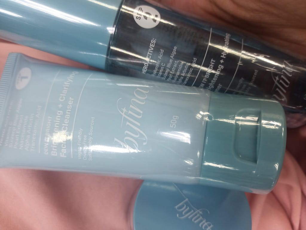 Step 1: Byfina Brightening + Clarifying Facial Cleanser (50g) - Apply an appropriate amount of the cleanser and gently lather all over face, neck and décolletage. Rinse thoroughly preferably with lukewarm water.